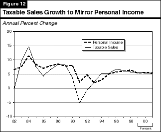 We expect that taxable sales will continue to expand at a moderate pace during the next three years. Specifically, after increasing by 5.8 percent in 1998, we project that taxable sales will grow by 5.5 percent in 1999, 5.4 percent in 2000, and 5.2 percent in 2001. As indicated in Figure 12, we expect sales to increase at about the same pace as personal income through the forecast period. Our projections assume that inflation-adjusted spending on autos and other durable goods will subside from their recent rates of increases. However, sales of building materials will continue their strong growth, consistent with our projected increases in residential construction activity during the forecast period.