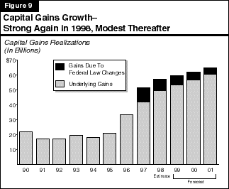 Recent Performance. Capital gains realizations totaled less than $20 billion annually during the first half of the 1990s. However, they have soared in the second half of the decade. As shown in Figure 9, capital gains more than doubled between 1995 and 1997--reaching $51 billion--and we estimate that they increased by another 11 percent in 1998, to $58 billion. Most of the growth has been related to the major increases in the U.S. stock market. However, we also believe that the reduction in the maximum federal tax rate on capital gains also played a role, especially in 1997, by leading certain investors to "cash out" their gains.