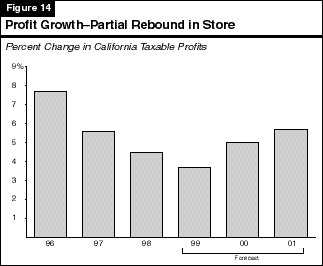 Corporate tax prepayments in 1998 suggest that earnings growth remained modest last year, increasing by an estimated 4.5 percent from 1997. A key factor depressing profit growth in 1998 was likely the impact of Asia's economic problems on the sales and earnings of California's high-tech manufacturing companies.