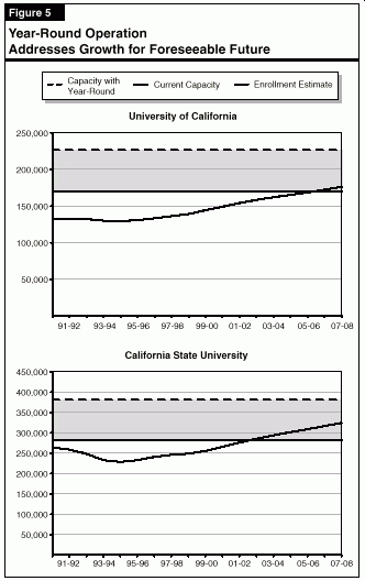 If the state implemented year-round operation, it would have the effect of increasing the "capacity" of the higher education segments by up to one-third. Figure�5 illustrates the additional capacity year-round operation would provide at UC and CSU. As shown in Figure�5, a total of over 150,000 FTE additional students could be accommodated within existing facilities at UC and CSU by adoption of year-round operation. This is significantly higher than the 113,000 FTE student enrollment increase projected by 2007-08. Thus, under a full program of year-round instruction, both UC and CSU would have ample capacity well beyond 2007-08.
