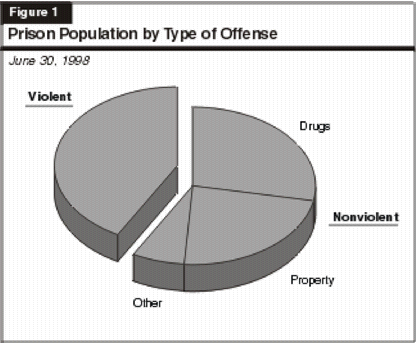 Figures 1 through 5 illustrate the characteristics of the state's prison population, which was 158,207 as of June 30, 1998. The charts show: