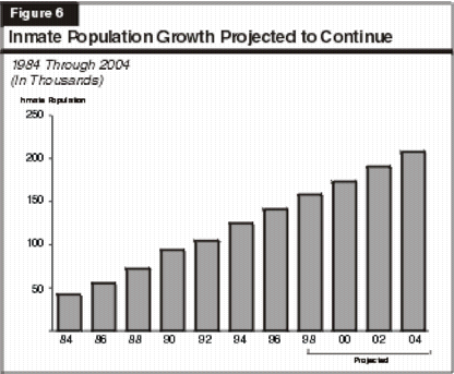 The Department of Corrections projects that the prison population will increase over the next five years, reaching a total of almost 208,000 inmates by June 2004. This represents a slower rate of growth than the department has experienced in the 1990s. Recent trends indicate, however, that the growth rate will be even slower than the new projections would suggest.