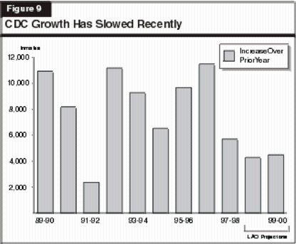 During the first half of 1998-99, the prison population grew at the lowest rate in many years--about 1,700 inmates, or 1 percent, on an annual basis. As can be seen in Figure 9, it has not been unusual in recent