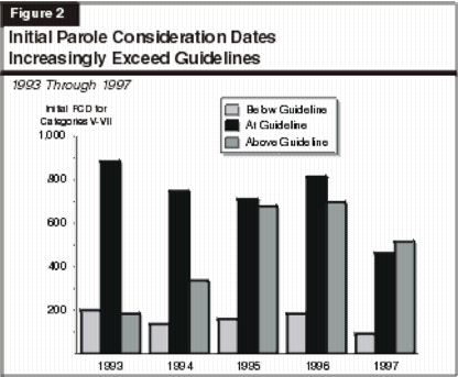 The Board Often Exceeds Its Own Guidelines. In attempting to gain a better understanding of the increasing length of stay, particularly for the less serious offenders, we reviewed the distribution of PCDs compared to the board's PCD guidelines. These guidelines are set by the board as presumptive PCDs that the board believes are generally appropriate for each offense category, recognizing that special circumstances may call for shorter or longer lengths of stays. They are contained in Title 15 of the State Administrative Code (for examples of the offenses included in each category, see the Youth Authority analysis earlier in this chapter).