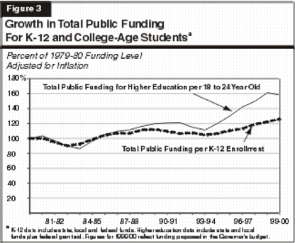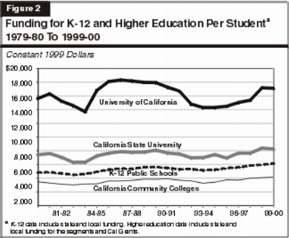 California (UC) represents about $15,700 per FTE student. To place funding for K-12 and higher education into a historical perspective, we have compared funding per student for K-12 schools and