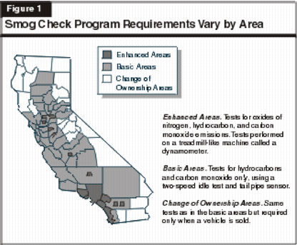 based on air quality--enhanced, basic, and change of ownership. The smog test required varies by area (see Figure 1).