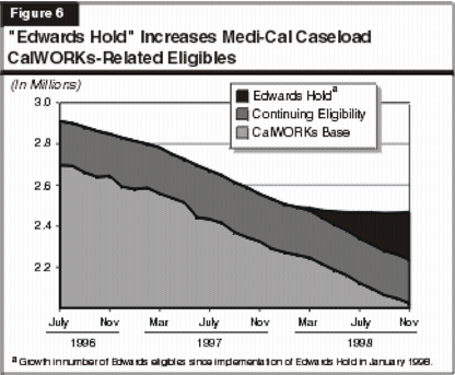 Effect of Edwards Hold Should Be Temporary. As we discuss in the preceding issue, the Edwards Hold is the major reason why the Medi-Cal caseload declines more slowly than the CalWORKs welfare caseload in the current year. However, this should be a temporary phenomenon limited to the current year. If DHS and the counties focus their efforts, then redetermination of eligibility for the great majority of the Edwards Hold caseload should be completed prior to 1999-00, and we expect (for the reasons explained above) that most of the Edwards Hold caseload will not remain on the Medi-Cal rolls.