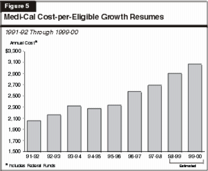 The continued upward trend in spending reflects, in part, costs for recently completed hospital construction projects and the ongoing increase in county administration costs. The primary driver of the spending growth, however, is an increase in the cost and utilization of services by Medi-Cal beneficiaries. Figure 5 illustrates this trend. From 1991-92 through 1995-96, the average cost per Medi-Cal eligible grew at an annual rate of 3.2 percent. Between 1995-96 and 1998-99, however, the annual rate of growth has increased to an average of 7.8 percent.