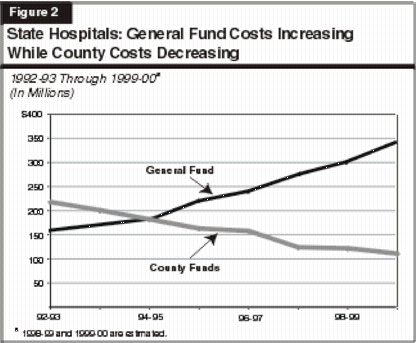 We recommend the adoption of budget bill language requiring the Department of Mental Health to develop a marginal cost methodology for funding annual caseload changes at the state hospitals, rather than the current average cost methodology, in order to more accurately reflect the costs of supporting additional patients.State hospital funding adjustments for caseloads are made annually according to anticipated changes in the number and types of patients who will be admitted to the four institutions. The department's budget proposals for caseload changes not only include increases or decreases in overall funding, but also reflect changes in the sources of funding for different types of patients. In recent years, for example, the hospitals have housed a growing number of patients who are judicially committed under various sections of the Penal Code or civilly committed as Sexually Violent Predators. These patients are funded using General Fund monies. At the same time, there has been a decline in the number of patients placed and funded in hospitals by county mental health departments. As a result, General Fund expenditures have increased while reimbursements from the counties have declined significantly (see Figure 2).
