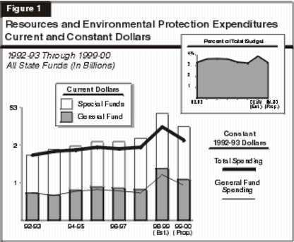 Expenditures for resources and environmental protection programs from the General Fund and various special funds are proposed to total $2.5 billion in 1999-00, which is 3.3 percent of all state-funded expenditures proposed for 1999-00. This level is a decrease of about $360 million, or 13 percent, below estimated expenditures for the current year.