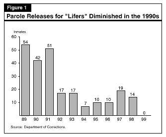 Lifer Releases Essentially Discontinued. As shown in Figure�1, the number of lifers released to the community diminished during the 1990s according to California Department of Corrections (CDC) data. During the 1989 calendar year, 51 first-degree and three second-degree murderers were released on parole by the BPT. By 1998, the number had decreased to 14--two first-degree and 12 second-degree murderers. Notably, this dramatic slowdown in the rate of parole for lifers occurred even as the pool of lifer inmates eligible for release grew by 300 to 700 inmates per year.