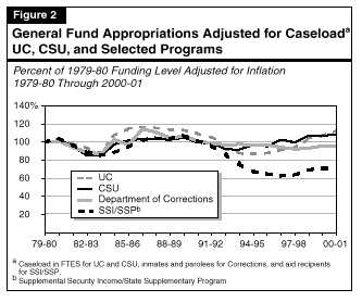 The budget proposes a $750 million increase in General Fund expenditures for higher education in 2000-01. This is an increase of 9.8 percent above estimated expenditures in the current year. This funds enrollment growth above demographic projections for all three segments. It also funds base increases at twice the rate of inflation for the University of California and the California State University and at the rate of inflation for the California Community Colleges. The budget also provides funding for several new and expanded program initiatives.