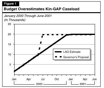 The budget estimates that the Kin-GAP caseload will begin with 1,629 cases in January 2000 and increase by about 1,630 cases each month in the current year, ending with a caseload of 9,783 in June of 2000. The budget projects that the caseload will more than double (to 19,880 cases) in the one-month interval from June to July of 2000 and remain at this "full-implementation" level throughout 2000-01. When comparing the average monthly caseload in 2000-01 to the average for the six months covered in the current year, the budget projects a 248 percent increase.