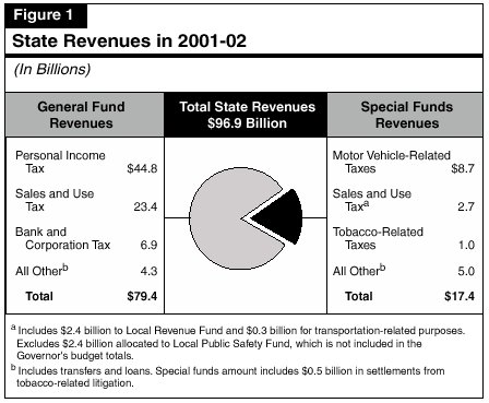 The budget projects that California state government will collect an estimated $97 billion in taxes and other revenues in 2001-02. As indicated in Figure 1, over four-fifths of these revenues are deposited into the General Fund, where they are allocated through the budget process each year for such purposes as K-12 and higher education, health, social services, criminal justice, and resources programs. The remaining one-fifth of revenues is deposited into numerous special funds, where they are earmarked for specific purposes. For example, motor vehicle fuel taxes support transportation programs, most tobacco taxes support a variety of targeted health programs, and vehicle license fees (VLFs) are allocated to local governments. Some taxes, such as the sales and tobacco taxes, are distributed amongst both the General Fund and special funds.