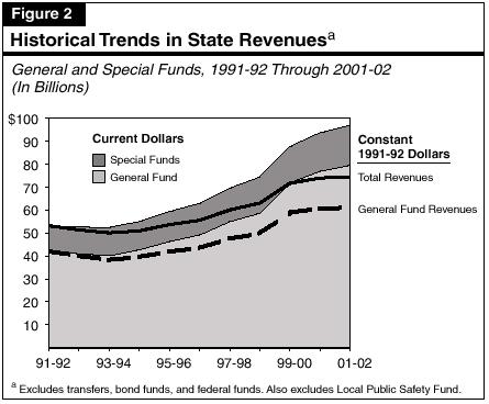 Tax receipts are primarily influenced by changes in the state's economy, although other factors, such as law changes and soaring stock market values, have also played a significant role in recent years. Figure 2 shows total state revenues, General Fund revenues, and special funds revenues over the past decade, in both current-dollar and "real" (that is, inflation-adjusted) terms.