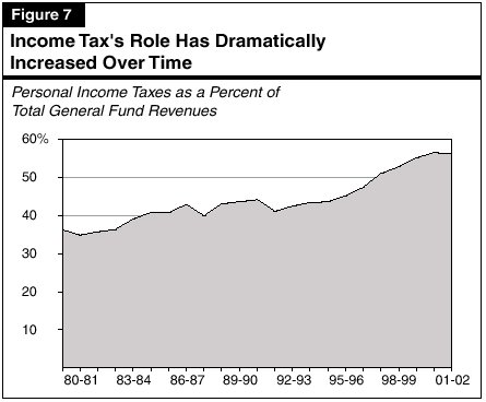 As shown in Figure 7, the share of total General Fund revenues attributable to the PIT has increased from about 38 percent in 1980-81 to nearly 57 percent in 2000-01. The share increased considerably throughout the 1980's economic expansion, retreated slightly during the early 1990's recession, and then soared during the second half of the decade. Between 1995-96 and 1999-00, receipts from this source increased at an average annual rate of 17.3 percent, or nearly three times as fast as statewide personal income growth.