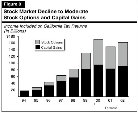 Current Outlook for Capital Gains and Stock Options Based on cash receipts through the end of 2000, we estimate that capital gains and stock option-related income grew by over 30 percent during 2000. This growth occurred even as the stock market's major indexes fell during the yearwith the NASDAQ down at year-end by more than 40 percent from the beginning of the year and by more than 50 percent from its March 2000 peak. It appears that many stocks were sold as investors and employees attempted to "cash out" gains that had accumulated in previous years. While this increased "profit taking" boosted gains attributable to 2000, the amount of "stored-up" gains that remain to be realized has correspondingly diminished. As a result, we are forecasting that revenues at tributable to these sources will fall by 15 percent in 2001, before rebounding by 9 percent in 2002.