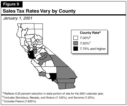 State Rates. The main component of the overall SUT rate is the 5 percent General Fund rate (which in January was reduced to 4.75 percent for 2001 under the terms of 1991 sales tax trigger legislation discussed earlier). Also included are two 0.5 percent rates, whose proceeds are deposited, respectively, into (1) the Local Revenue Fund, which supports health and social services program costs associated with the 1991 realignment legislation and (2) the Local Public Safety Fund, which was approved by the voters in 1993 for the support of local criminal justice activities.