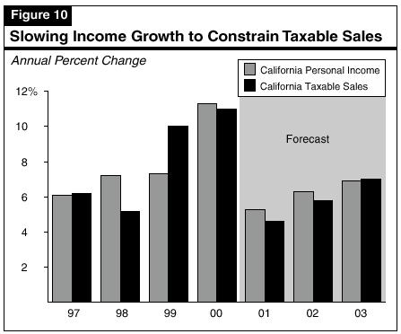 We forecast that taxable sales growth will slow sharply during 2001 before partially rebounding in 2002. Key factors behind the expected slowdown are the downturn in California's personal income growth, the effects of sharply reduced consumer and business confidence levels, and a partial reversal of the wealth effect (caused by declining stock market values). Recent sharp increases in energy costs and rents are also likely to cut into the budgets of lower-income and moderate-income households, thereby putting more downward pressure on their discretionary spending on taxable items. Finally, the sharp cutback in business investment plans will have a dual adverse effect in California. First, it implies less business-to-business sales of information technology products in the state. Second, it will also have impacts on the expansion plans of California's high-tech companies, which will reduce taxable sales of building materials.