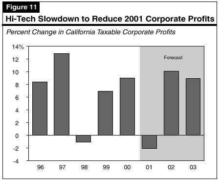 We expect that the national and state economic slowdowns will cause corporate profits to decline in 2001 (see Figure 11). All industries will feel the impacts of slowing sales, as well as rising costs for compensation (particularly health care benefits) and energy. The slowdown in information technology-related sales will have a particularly significant negative impact on California's high-tech manufacturers and service providers. We look for profit growth to rebound in 2002, however, as cost pressures subside and sales improve.