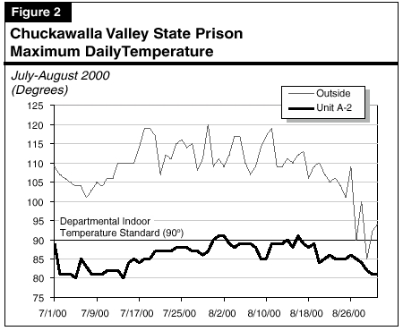 Existing Air Conditioning System. The existing air conditioning system consists of evaporative cooling units, designed to maintain the department's standard for indoor temperature of 90 degrees in inmate housing units. The department has provided temperature data for outside conditions and inside conditions for three representative housing units. As shown in Figure 2, the outside temperature averaged around 110 degrees during July and August last year. The temperatures inside the prison varied by a maximum of about 5 degrees. Figure 2 shows the maximum temperature conditions for Unit A-2, which averaged around 85 degrees during July and August of last year, and exceeded 90 degrees (by about 2 degrees) during 5 separate days (8 percent of the days for which information is available) for a total time of around 30 hours. According to the institution, this occurred mostly when power conservation measures were in effect. Thus, according to available data, the existing units adequately maintain the temperature inside the housing units within the department's standard.