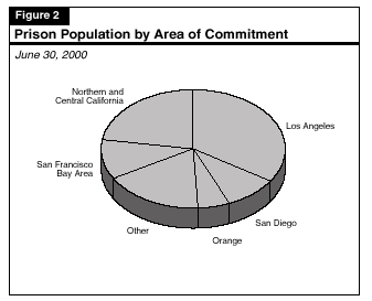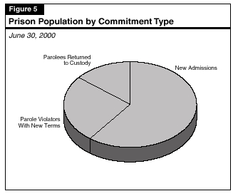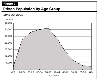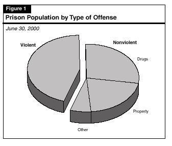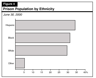 Figures 1 through 5 illustrate the characteristics of the state's prison population, which was 162,000 as of June 30, 2000. About 93 percent of the population is male. The charts show: