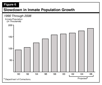 The California Department of Corrections (CDC) is projecting slower growth in the prison population than the state experienced through much of the 1990s. The CDC projections suggest that the number of inmates will exceed 185,000 by June 2006. Recent prison population data suggest, however, that the growth rate is even slower than assumed in the Governor's budget and that the population is continuing to stabilize.