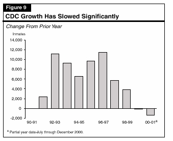 Actual Inmate Count Is Lower Than Fall Projections. During the first half of 2000-01, the prison population had been projected to increase slightly by 153 inmates over the prior year. Instead, it decreased by about 1,300 as shown in Figure 9. Given the historical pattern of inmate population growth, it is likely that this downward trend will reverse itself in the spring of 2001, when more inmates normally are admitted into the prison system than at other times of the year. Even if there is a turnaround in the trend this spring, however, it appears unlikely that CDC will experience a population gain in the current year of 1,898 inmates as forecast in the fall 2000 projections. Actual growth may be less than 1,000 inmates.