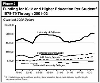 To place funding for K-12 and higher education into an historical perspective, we have compared state and local funding per FTE student in the four public segments from 1978-79 through 2001-02, adjusting for the effects of inflation over this 23-year period (see Figure 2). As the figure shows, per-student funding for each segment is at or near highs for this period.
