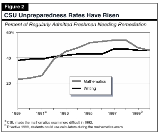 Almost Half of Regularly Admitted CSU Students Arrive Unprepared in Writing and Mathematics. Figure 2 shows the CSU systemwide unpreparedness rate in writing and mathematics for regularly admitted freshmen over the last decade. In fall 1989, 38 percent of regularly admitted freshmen were unprepared for college-level writing and 23 percent were unprepared for college-level mathematics. By fall 2000, the unpreparedness rate in writing had increased by more than one-fifthto 46 percent. The unpreparedness rate in mathematics also increased sharply between 1989 and 1998when 54 percent of regularly admitted freshmen arrived unprepared. For the last two years, however, the unpreparedness rate in mathematics has fallendropping to 45 percent in fall 2000.