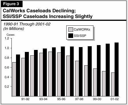 CalWORKs and SSI/SSP Caseloads. Figure 3 shows the caseload trend for CalWORKs and SSI/SSP. While the number of cases in SSI/SSP is greater than in the CalWORKs program, there are more persons in the CalWORKs programabout 1.4 million compared to about 1.1 million for SSI/SSP. (The SSI/SSP cases are reported as individual persons, while CalWORKs cases are primarily families.)