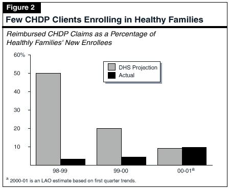 The best available indicator of the number of children enrolling in Healthy Families through CHDP is the level of reimbursement to CHDP for services provided to children who ultimately enroll in Healthy Families. In 1999-00, the most recent year for which data are available, only 4.5 percent of the new enrollees in Healthy Families had reimbursed CHDP claims. This represents a slight increase over 1998-99, when claims were reimbursed for only 3.4 percent of new Healthy Families enrollees. Due to a recent change in the retroactive claiming periodfrom 30 days to 90 dayswe estimate that CHDP will be reimbursed for 9.6 percent of Healthy Families' enrollees in 2000-01. However, this is still a relatively small number of CHDP clients. Figure 2 shows initial expectations for CHDP reimbursements compared to actual reimbursements.