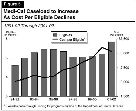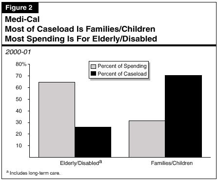 The average cost per eligible for the aged and disabled Medi-Cal caseload (including long-term care) is much higher than the average cost per eligible for families and children on Medi-Cal. As a result, almost two-thirds of Medi-Cal spending is for the elderly and disabled, although they account for only about one-fourth of the total Medi-Cal caseload, as shown in Figure 2.