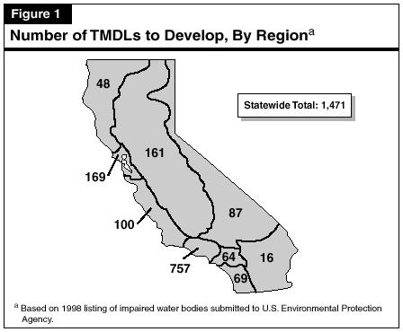 Current State List of Impaired Water Bodies. The most recent list of impaired water bodies in the state (1998) lists 509 impaired water bodies for which 1,471 TMDLs have to be developed. (The next list will be submitted to U.S. EPA in 2002.) As shown in Figure 1, there are impaired water bodies in every region of the state, with the largest number of impaired water bodies located in the Los Angeles region.