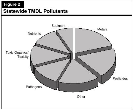 Figure 2 shows the breakdown of TMDLs to be developed based on pollutant. As shown, metals and pesticides are the leading contributors to impaired water bodies.