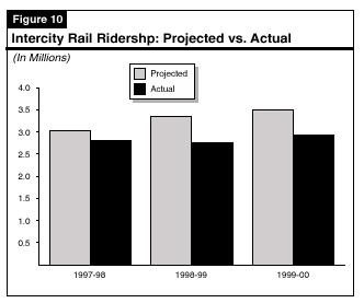 Accurate Projections Are Difficult, However. In the past, Caltrans has been too optimistic in its intercity rail ridership projections. As shown in Figure 10, actual ridership has been between 7 percent and 18 percent below the department's ridership projections from 1997-98 through 1999-00. To the extent the projected ridership fails to materialize, the state subsidy would remain high.