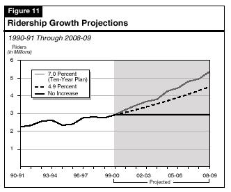 Figure 11 compares the department's projected annual ridership under its ten-year plan with two scenarios: (1) no increase in ridership and (2) a 4.9 percent increase (the average annual increase from 1995-96 through 1999-00). Figure 11 shows that the department's projected growth of 7 percent would, at the most, increase ridership by a cumulative total of 12 million over ten years. Using a lower ridership growth rate of 4.9 percent results in a cumulative increase in ridership of about 7 million.