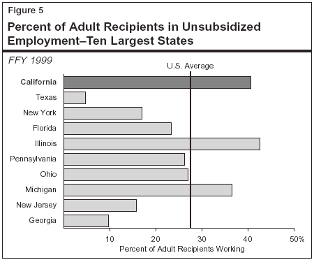 Unsubsidized Employment. In terms of the percentage of all adults who worked in unsubsidized employment, California's rate of 41 percent was well above the national average of 28 percent, as shown in Figure 5. On this measure, California ranked second both among the ten largest states and overall.