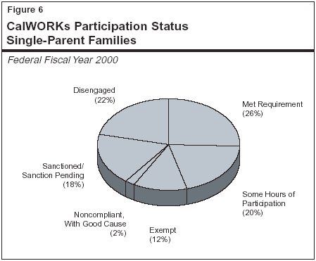 Unlike single-parent families, it is not possible to determine how many of the two-parent cases with zero hours of participation were in sanction (or sanction pending) status, how many had good cause for not participating, and how many were disengaged from the program. This is due to data limitations that the Department of Social Services indicates will be corrected for the FFY 2001 participation data.