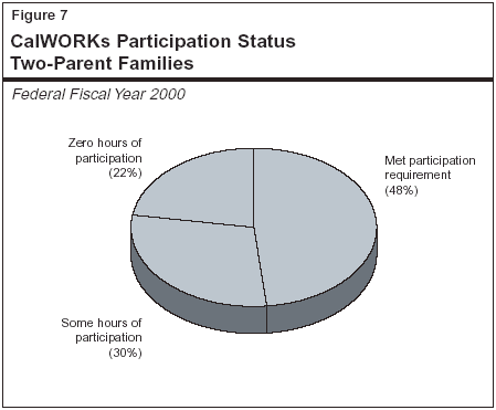 Two-Parent Families. The average monthly caseload of two-parent families in FFY 2000 was about 65,000. By definition, both adults in two-parent families must be able-bodied and therefore are not exempt from the work participation requirement. As seen in Figure 7, 48 percent of the two-parent cases met the CalWORKs participation requirement. Of these cases, the majority (85 percent) met the requirement solely through unsubsidized employment. An additional 29 percent of the caseload participated in some activity but for insufficient hours to meet the requirement. Finally, nearly one-quarter of the two-parent caseload—22 percent—had zero hours of participation.
