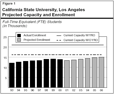 Project Not Justified by Enrollment. Construction of the proposed new Science Replacement Building, renovation of the existing Biological Sciences Building, and demolition of the Physical Sciences Building would reduce the physical campus capacity (without year-round operation) by 153 FTE to 16,175 FTE. However, with year-round operation the campus instructional capacity is about 21,000 FTE per year. Enrollment at CSU Los Angeles has not increased significantly in the past ten years. Figure 1 shows that in the past ten years enrollment has been between 12,000 and 14,000 FTE, which is well within the capacity of the existing facilities at the campus. The CSU projects enrollment growth at the Los Angeles campus up to about 15,000 FTE by 2006.
