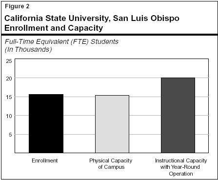 Project Not Justified Under Year-Round Operation. Even though the current physical capacity of the campus is 15,347 FTE students, if the campus operated year-round at approximately equal enrollments in all terms, the instructional capacity of the campus would be about 20,000 FTE students (see Figure 2). This means the campus could serve about 20,000 FTE students annually without having to increase the physical capacity of the campus. Currently the summer term enrollment at the San Luis Obispo campus is only about 18 percent of that in other terms. If facilities were more fully utilized during summer term, the campus could handle a lot more enrollment growth without additions to its current physical capacity.