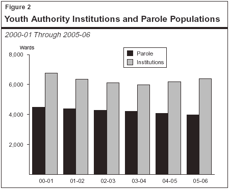 The number of parolees is expected to decrease slowly through 2006. Figure 2 shows the Youth Authority's institutional and parolee populations from 2000-01 through 2005-06.