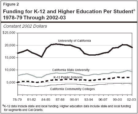 To place funding for K-12 and higher education into an historical perspective, we have compared state and local funding per FTE student in the four public segments from 1978-79 through 2002-03, adjusting for the effects of inflation over this 24-year period (see Figure 2). As the figure shows, per-student funding for each segment is at or near highs for this period.