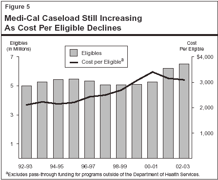Almost all Medi-Cal eligibles fall into two broad groups of people. They either are aged, blind, or disabled or they are in families with children. More than half of Medi-Cal eligibles are welfare recipients. Figure 1 shows for each of the major Medi-Cal eligibility categories, the maximum income limit for eligibility for health benefits and the estimated caseload and total benefit costs for 2001-02. The figure also indicates, for each category, whether an asset limit applies and whether eligible persons with incomes over the limit can participate on a "spend down" basis. If spend down is allowed, then Medi-Cal will pay the portion of any qualifying medical expenses that exceed the person's "share-of-cost," which is the amount by which that person's income exceeds the applicable Medi-Cal income limit.