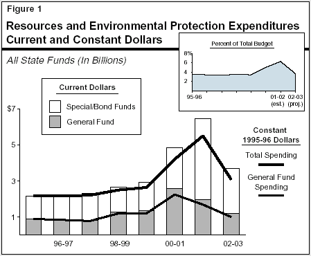 Expenditures for resources and environmental protection programs from the General Fund, various special funds, and bond funds are proposed to total $3.7 billion in 2002-03, which is 3.7 percent of all state-funded expenditures proposed for 2002-03. This level is a decrease of about $2.7 billion, or 43 percent, below estimated expenditures for the current year.