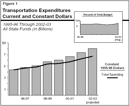 Figure 1 also shows that transportation expenditures as a share of state expenditures have remained relatively stable since 1995-96. In 2002-03, proposed transportation expenditures will constitute about 8.2 percent of all state expenditures.