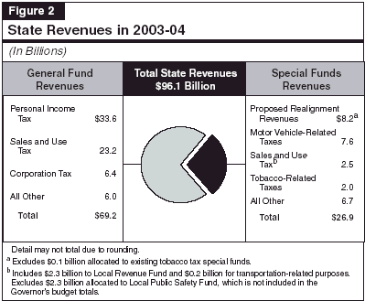 The 2003-04 Governor's Budget projects that California state government will receive $96.1 billion in revenues during 2003-04, a 9.1 percent increase from the current year. These revenues are deposited into either the General Fund or a variety of special funds. Figure 2 shows that: