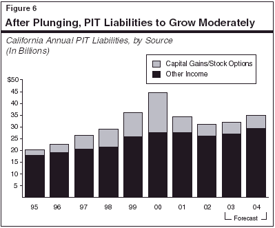 Factors Behind the Liability Forecast. As indicated in Figure 6, the majority of the PIT liability decline between 2000 and 2002 was related to a huge drop in stock options and capital gains, both of which are subject to PIT taxation. Combined PIT liabilities attributable to these two sources fell from $17 billion in 2000 to $6.5 billion in 2001, and further to $4.7 billion in 2002. Liabilities from other income sources, such as ordinary wages,