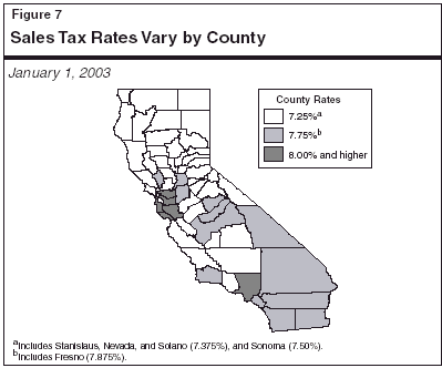 Combined SUT Rates. The combined state and local SUT rate varies significantly across California due to differences in the local optional rates that are levied. As depicted in Figure 7, the combined SUT rate currently ranges from 7.25 percent (for those counties with no optional rates) up to 8.5 percent (for the City and County of San Francisco). No county currently imposes the maximum allowable SUT rate of 8.75 percent. Imposition of the Governor's proposed 1 percent rate increase for realignment would boost the current SUT rates up to a range of 8.25 to 9.5 percent.